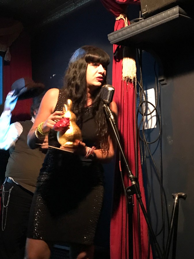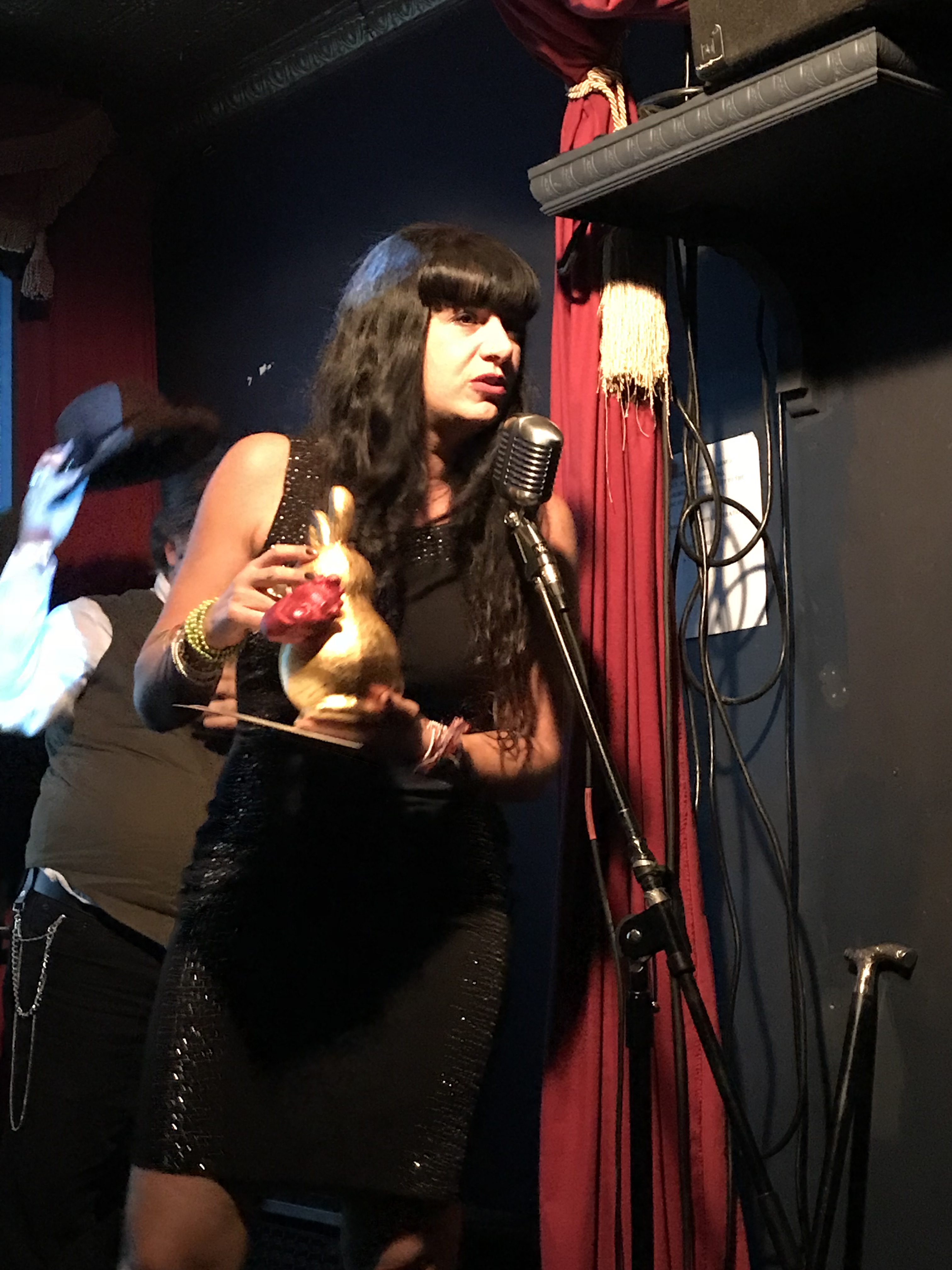 Rachel Kann beconing to Brad Cooper, accepting for Best Overall Production
